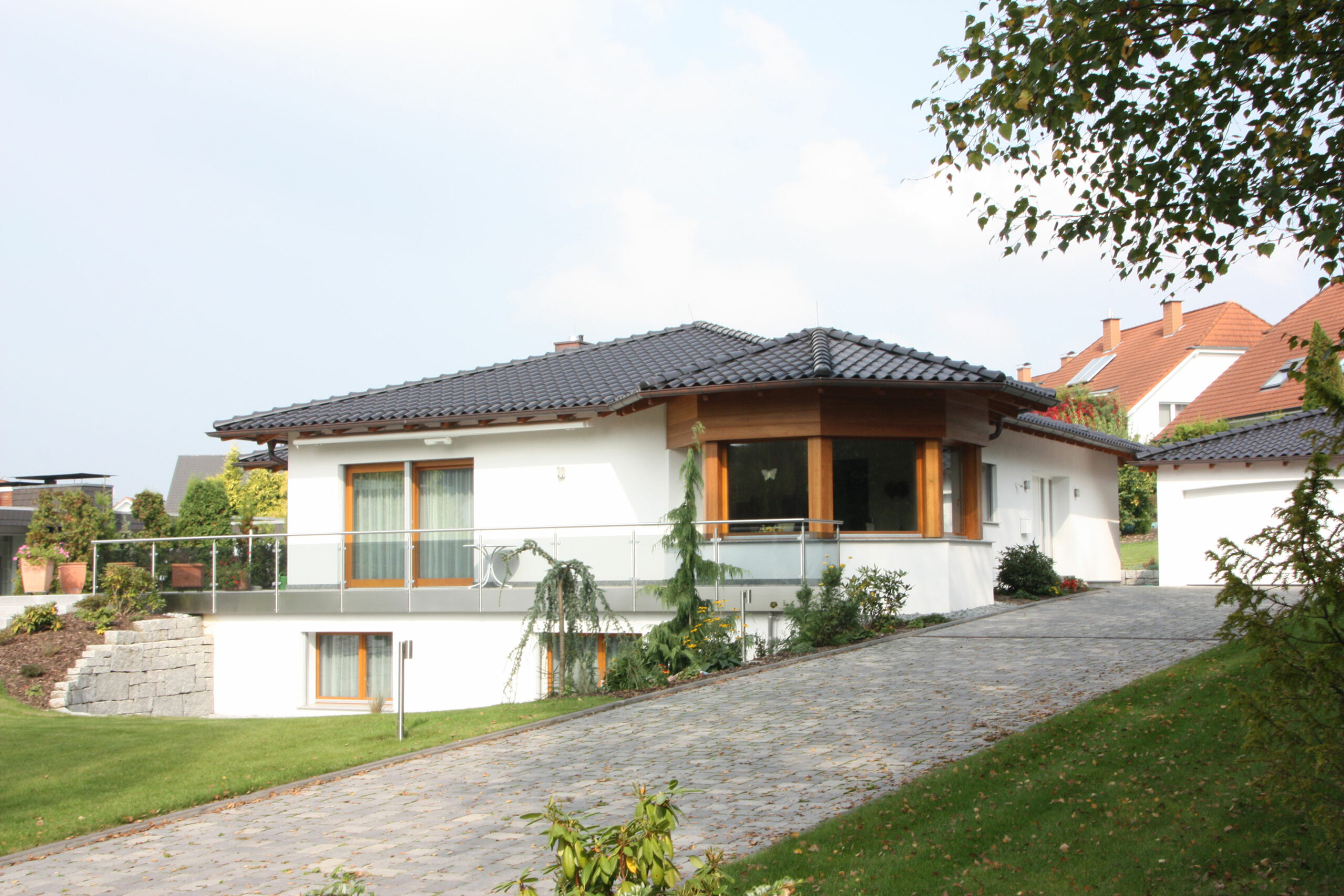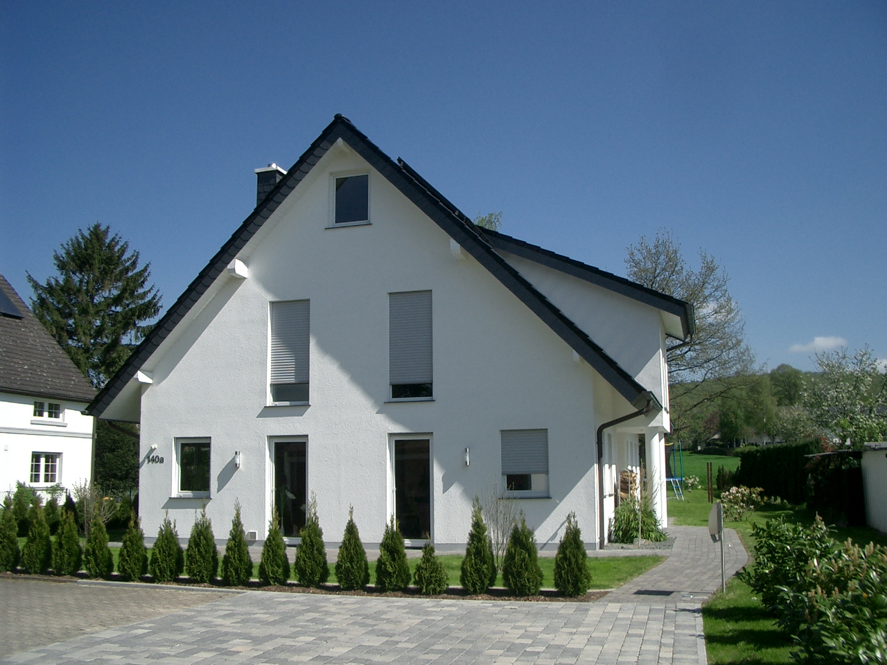 Der Neubau dieses großzügigen Einfamilienwohnhauses mit Wärmepumpe besticht durch einige Akzente aus Holz. Besonders zeichnet sich das Gebäude innen durch den offenen Blick auf die Sparren des Dachstuhls aus.